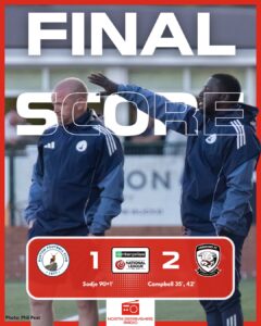 Report by North Derbyshire Radio’s Elliot Steadman Remaye Campbell struck twice for Hereford to seal victory over Buxton under the lights. The opening chance of the game went to Hereford when Omari Sterling-James launched a long ball forward towards Andy Williams, but goalkeeper Paul Cooper was quick off his line to claim it. Soon after,